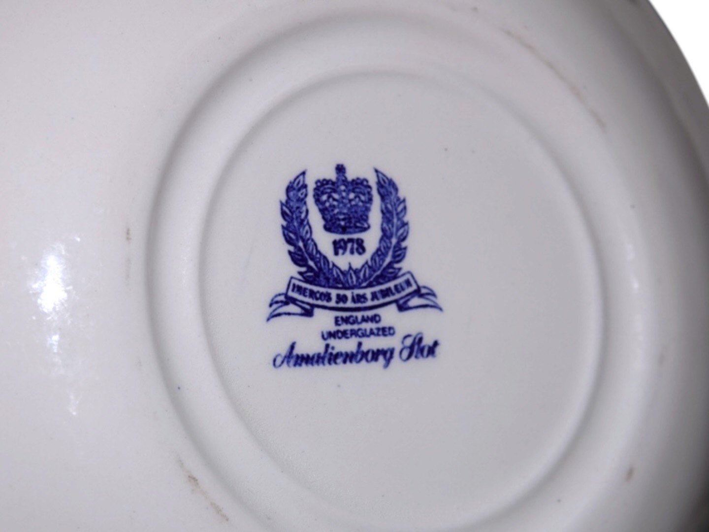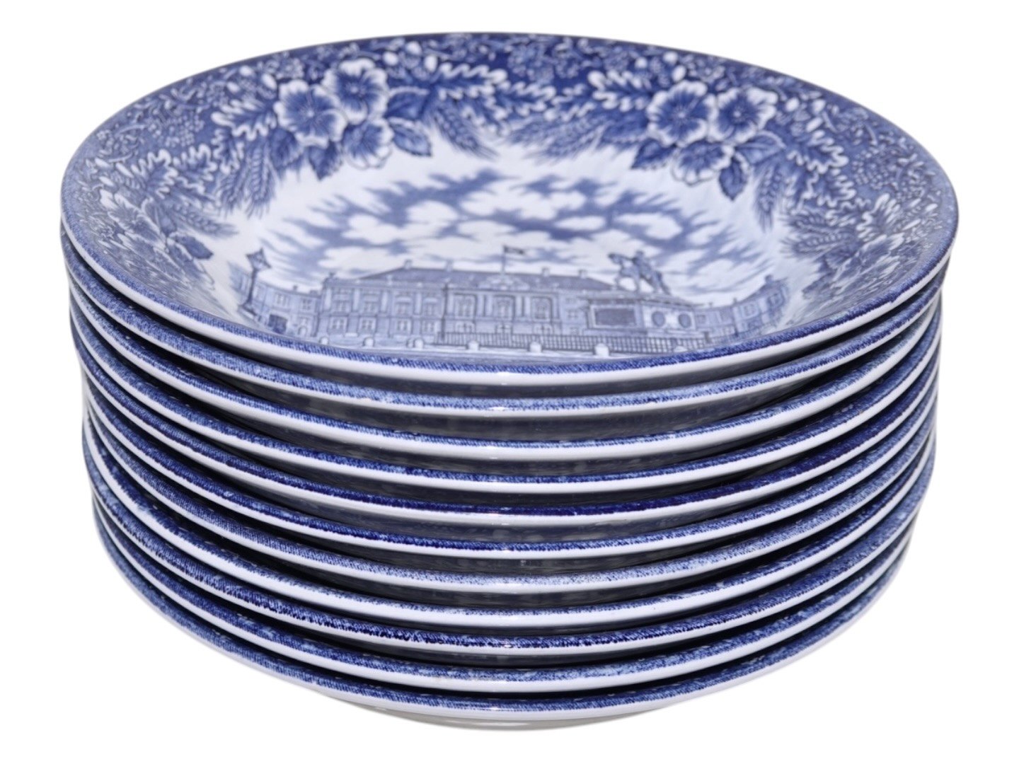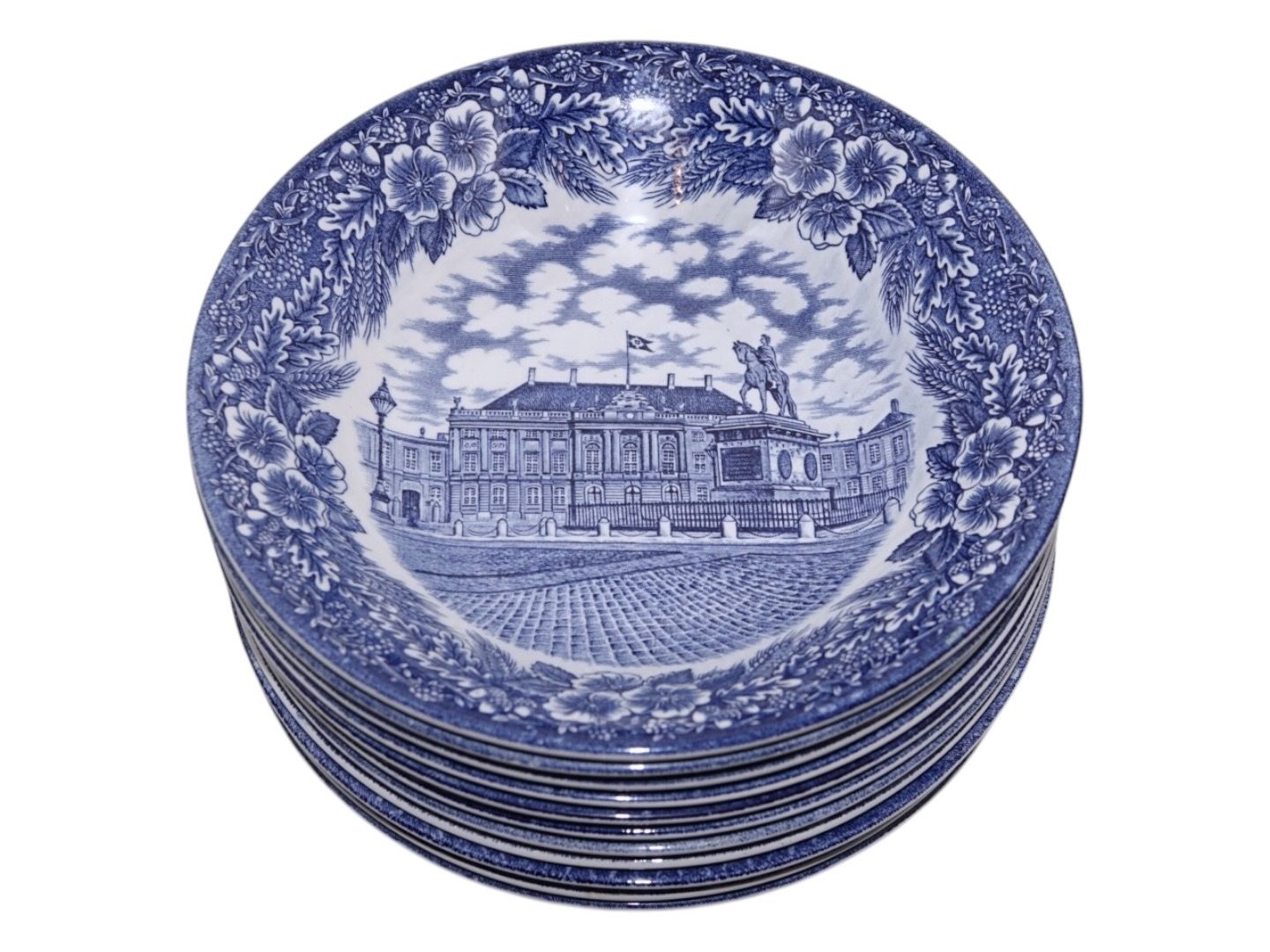 Engelsk fajance, lille dyb tallerken med Amalienborg Slot. Tyk kvalitet som hotelporcelæn / jernporcelæn.