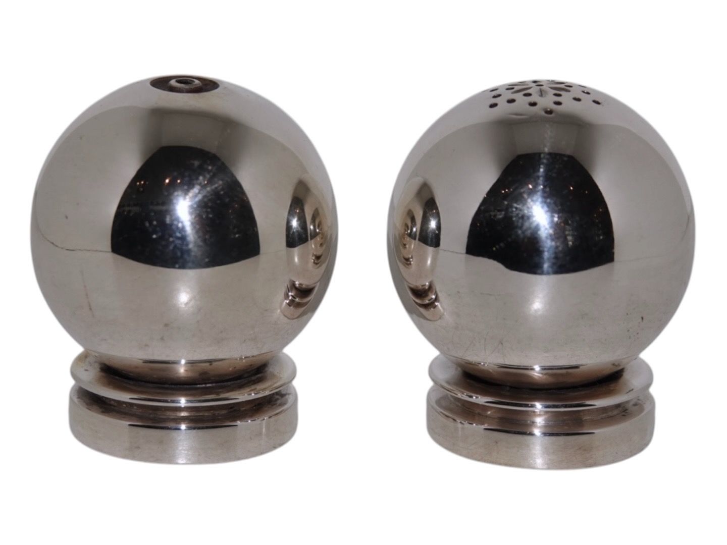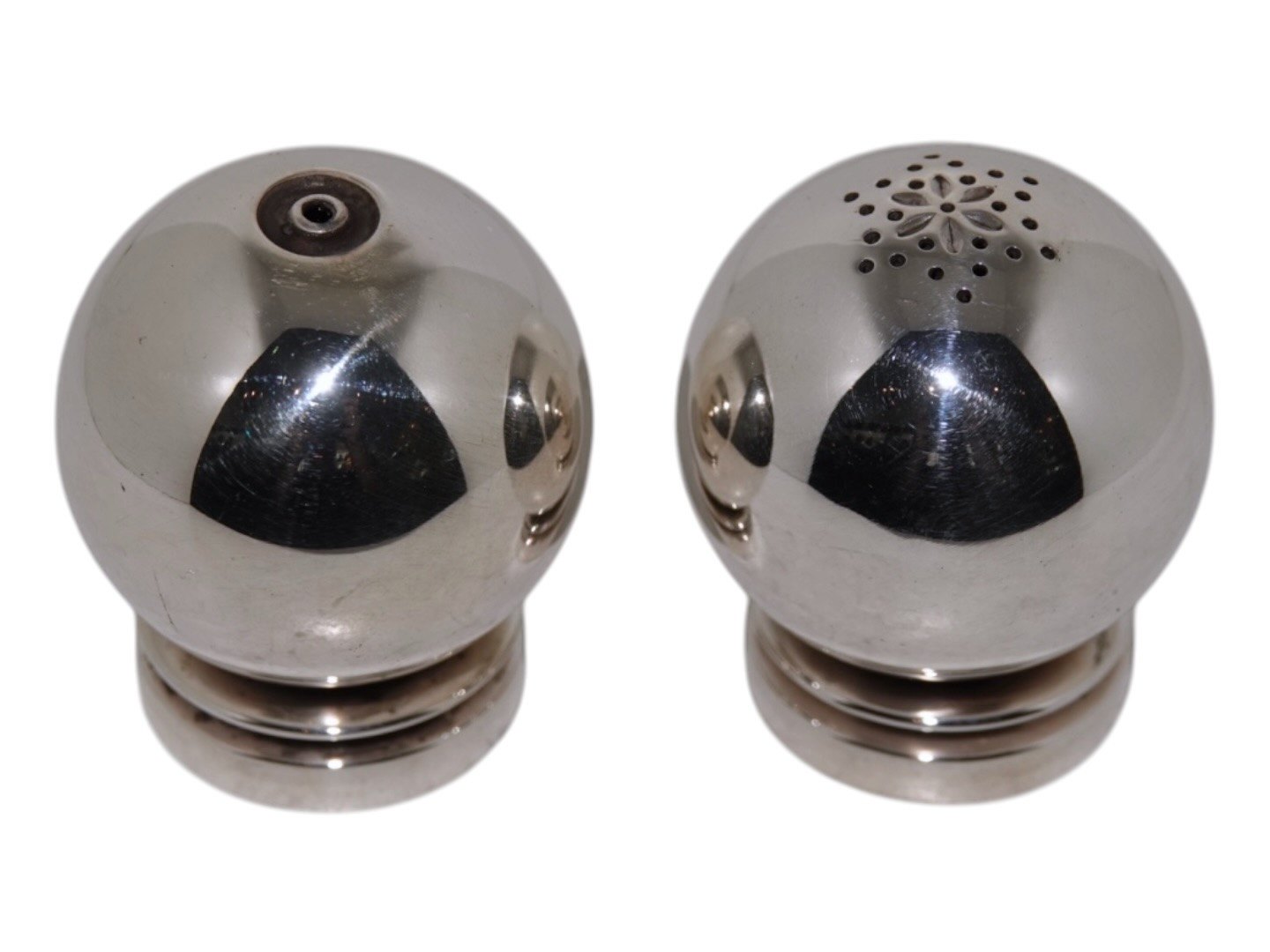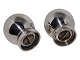 Georg Jensen sterling sølv saltbøsse og peberbøsse. Designet af Harald Nielsen. Disse er produceret i mellem 1933 og 1944. Højde 4,0 cm., bredde 3,5 cm. Perfekt stand uden indgraveringer. Prisen er for to (2) stk.