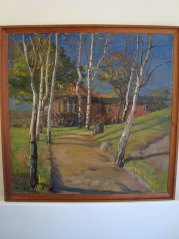 Stort smukt maleri med vej op mod hus - Carl J. Christensen 1940.