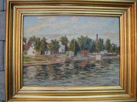 Maleri af ubekendt kunstner - Kystparti med huse og både i havn - Nordsjælland??