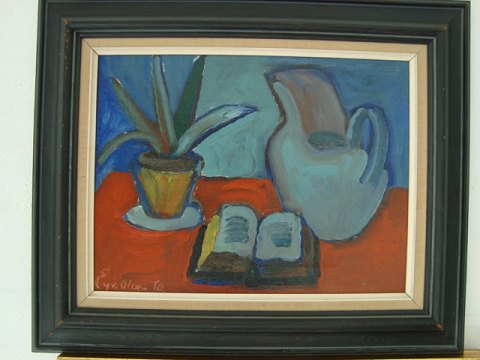 Maleri af Eyv. Olesen - Opstilling med kande og bog 1969.