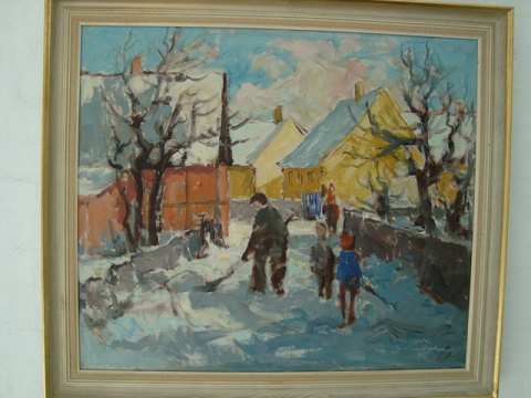Text available in Danish: Maleri af Svend Nielsen, Vinterparti fra Svaneke, Bornholm.