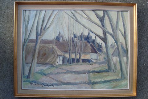 Maleri af Ole Sværdpiil 1962 - Landskab med huse og nøgne træer.