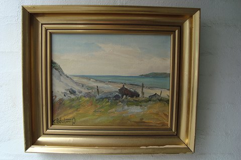 Maleri af Knud Bøstrup - Kystparti med opt. båd.