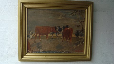 Maleri af Axel Skjelborg 1955 - Køer og får ved vandingshul.