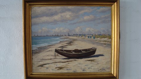 Parti fra Sønderstrand, Skagen med badehuse og båd.