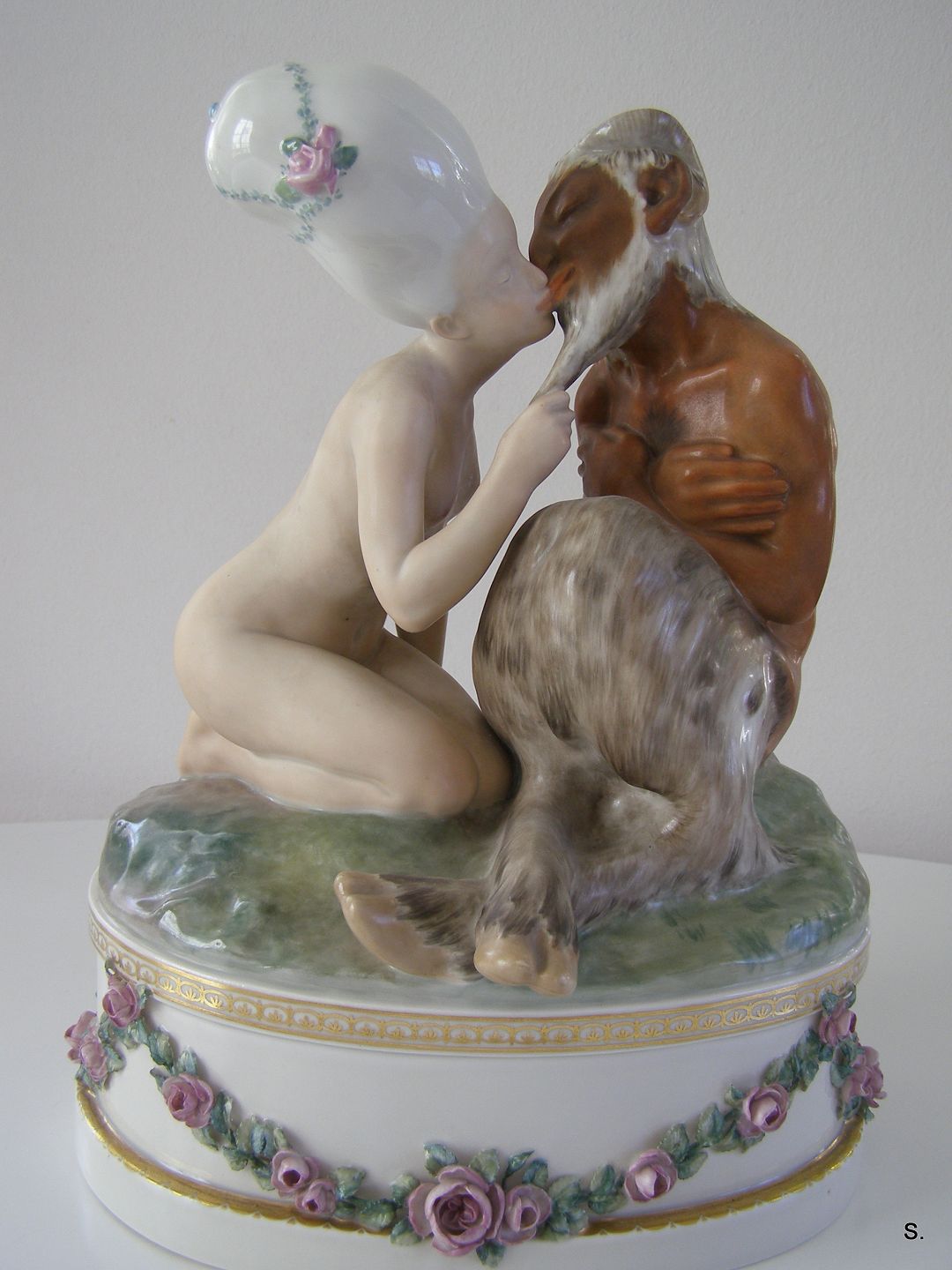 Gerhard Henning Faun og Nymfe Royal Copenhagen overglasur og Juliane Marie mærke H: 28cm B:21,5cm.