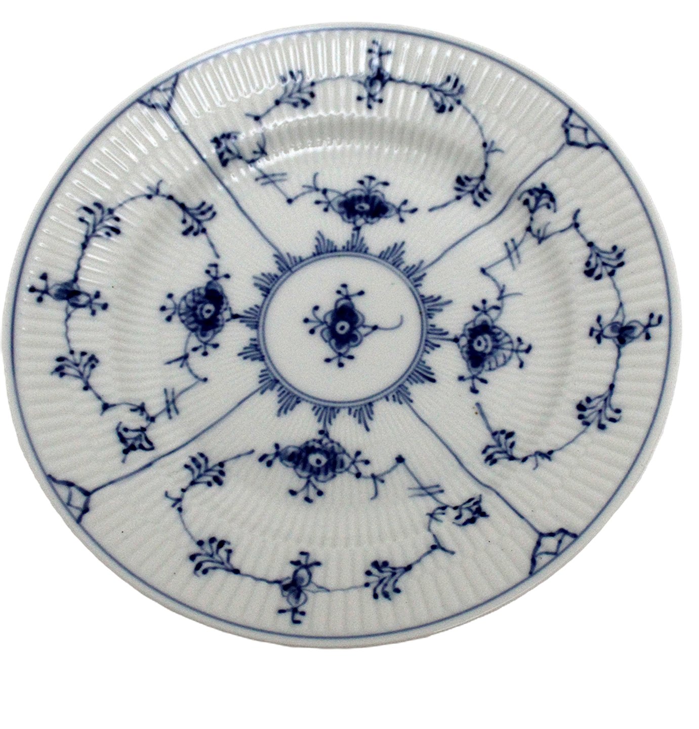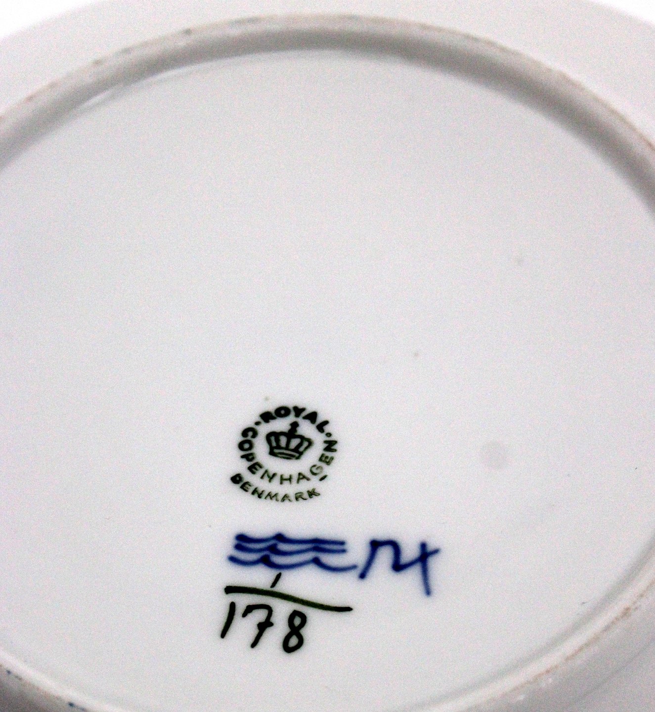 Royal Copenhagen, Musselmalet frokosttallerken. Nr. 1/178. Diameter 21 cm. I. sortering, men med brun brændingsplet se ekstrafoto med hvid baggrund. Foto med sort baggrund er modelfoto. Pris: 375 kr. stk. Lager: 1