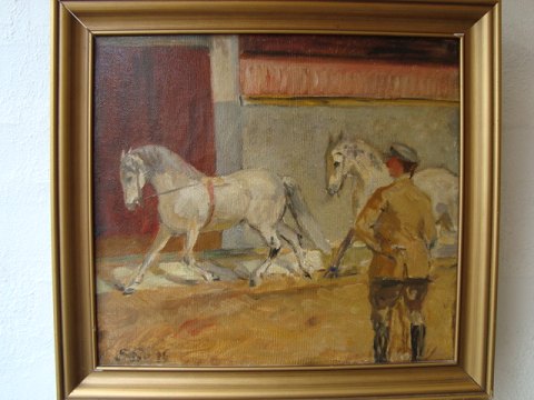 Maleri af Sven Schou - Domptør og heste i Cirkus Schumann.