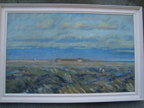 Maleri af Jakob Hübschmann - Marsklandskab med gård og græssende får.