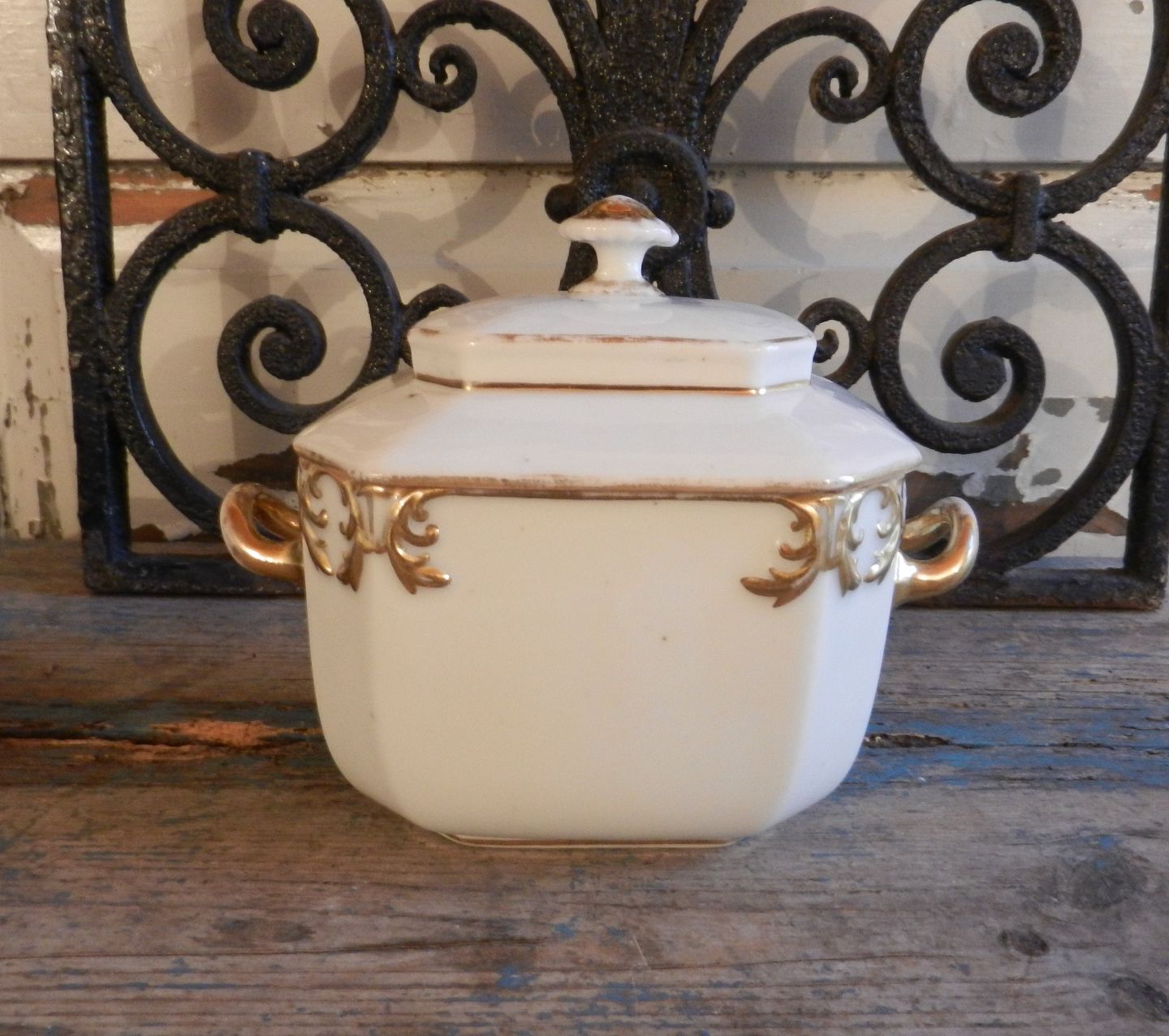 Fransk 1800tals sukker skrin, med enkel guld bemaling.
