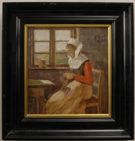 Hansen, Ane Marie (1852-1941): Interiør med hosestrikkende ung kvinde i folkedragt ved vinduet. Olie på lærred. Sign.: Monogram AMH. 35 x 31 cm. Skitse. Med sort ramme med indre guldkant.
