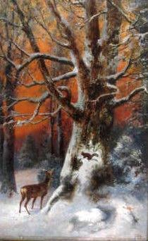 Englischer Künstler (19. Jh.): Ein Hirsch in einem verschneiten Wald mit einem Eichhörnchen. Öl auf Mahagoniplatte. 42 x 28 cm. Signiert Monogramm. AB. Mit dem neueren Goldrahmen. Auf der Rückseite mehrere Etikketten aus frührere Auktionen.