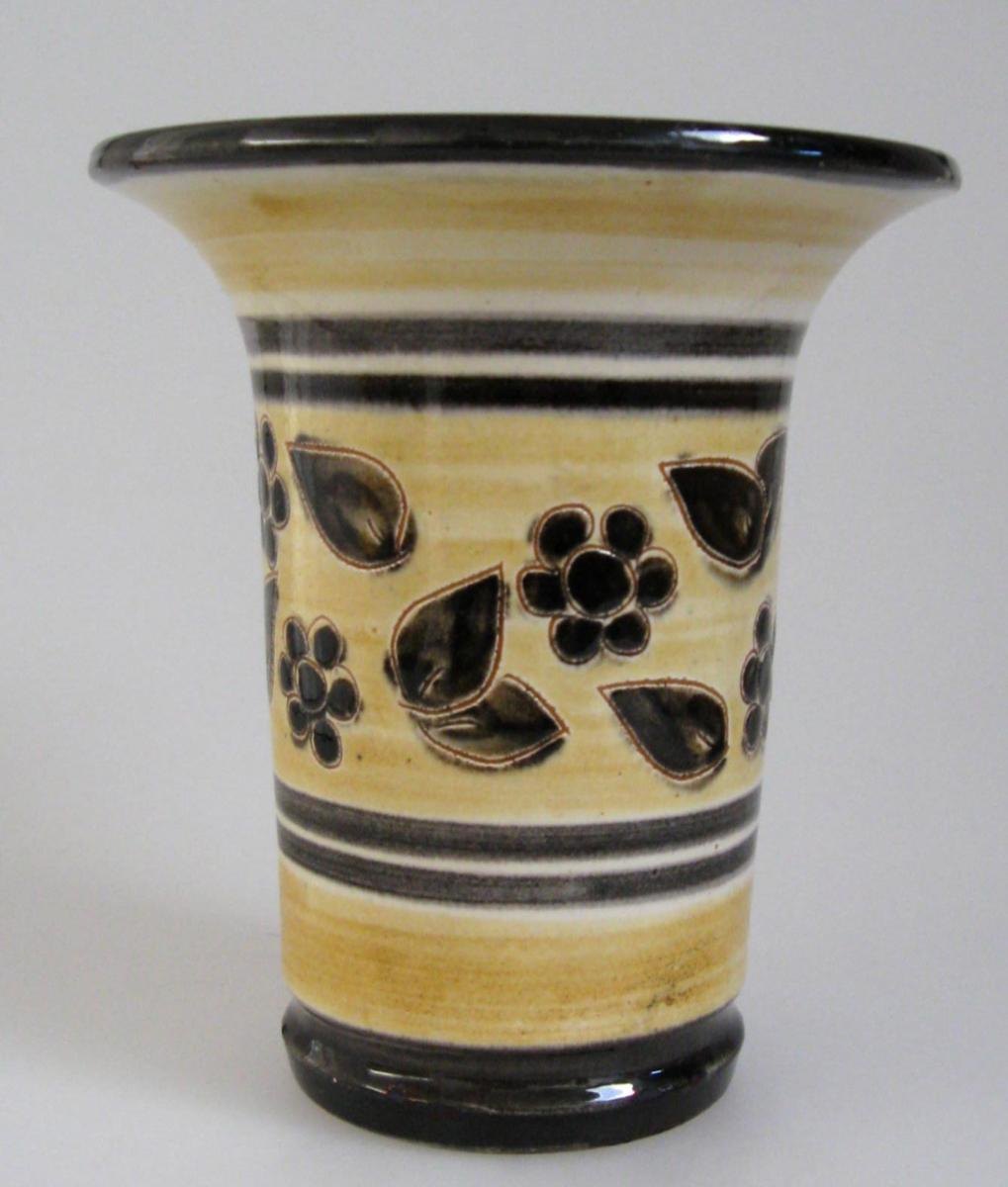 Humlebæk vase, 20. årh. Danmark. Lertøj, begittet og dekoreret i gult og sort med blomster med graveringer. Stemplet.: Humlebæk HK Danmark. H: 15 cm.