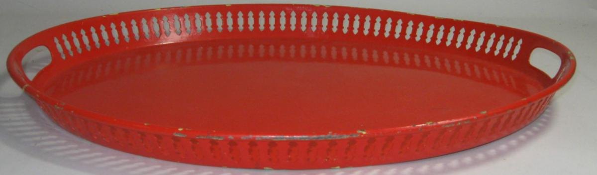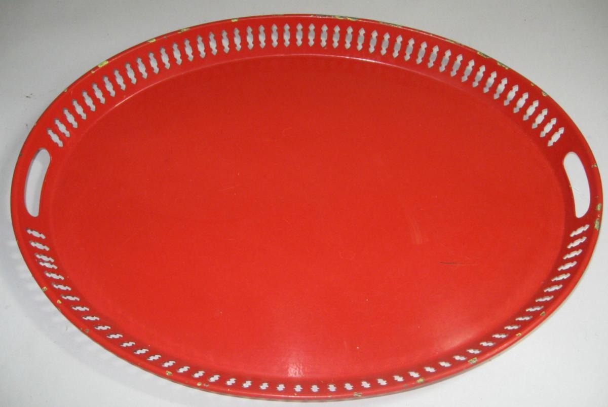 Svensk metalbakke, rødmalet, ca.1900, Med hanke og gennembrudt kant. L.: 55 cm. B.: 41 cm.