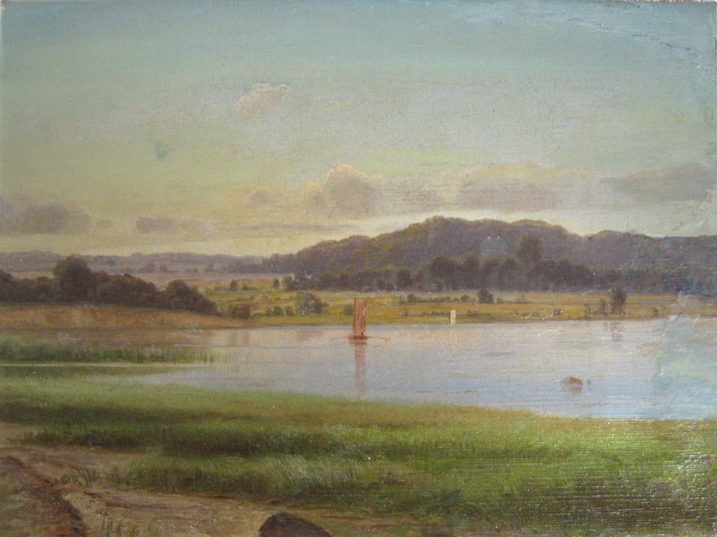 Schmidt, Alexander (1842 - 1903) Danmark: Sejlbåde på en sø, sommer. Signeret.: A. Schmidt 95. 18 x 24 cm. Uden ramme. Doubleret.