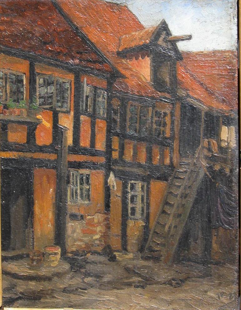 Rohde, Johan (1856 - 1935) Danmark: Parti fra en gammel bindingsværks gård. Signeret monogram: J.R 83. Malt på blik. 27 x 22 cm.