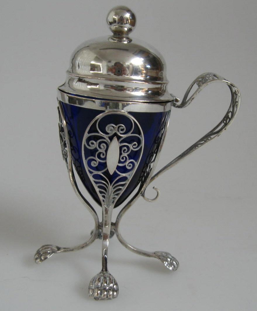 Sennepskande i sølv med blå indsats i glas. Æg korpus med løvefødder og filigran arbejde. Hvælvet låg med lågknop. Empire. Stemplet på det ene ben: CS for Carl Frederik Schytte (født ca. 1802), guldsmed i henholdsvis Fåborg, Kerteminde, Svendborg og Bogense.