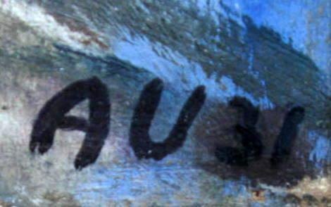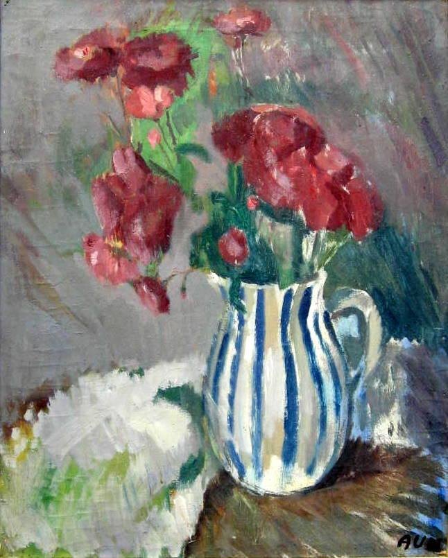 Ulmer, Axel Johannes (1884-) Danmark: Opstilling med blomster i en stribet kande på et bord. Olie på lærred. Signeret: Monogram 31. 58 x 45 cm. Med gråmalet samtidig ramme.