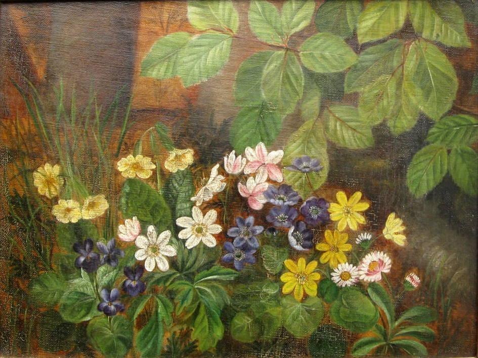 Dansk kunstner (19.årh): En skovbund med forårs blomster. Olie på lærred. Usigneret. 24 x 32 cm.