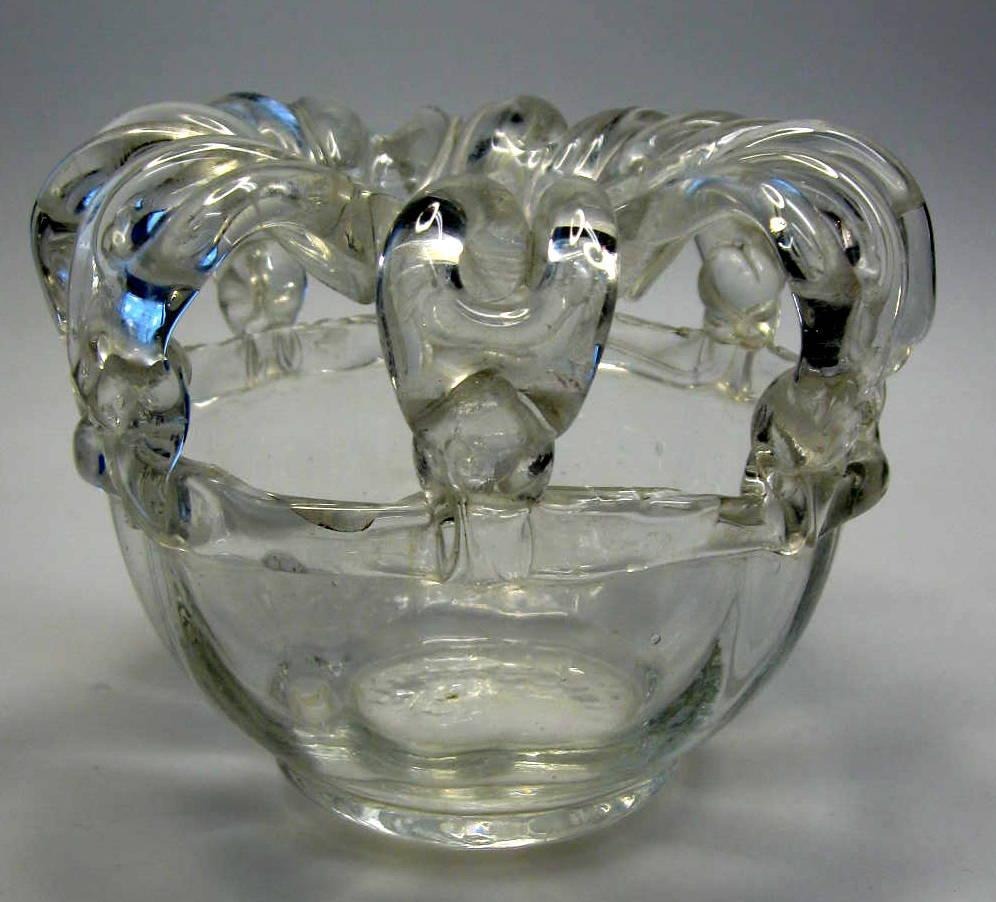 Brudekrone i glas, ca.1900, Danmark. Stor. H.: 12 cm. Dia.: 16 cm. Optisk drevet. Med sårrand i bunden. Proveniens.: Aarhusiansk familie. Antagelig glasfusk fra Aarhus Glasværk.