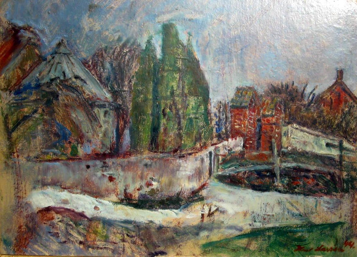 Larsen, Karl (1889 - 1992) Danmark: Landskab ved kirke. Olie på pap. Signeret.: Karl Larsen 44. 25 x 35 cm.