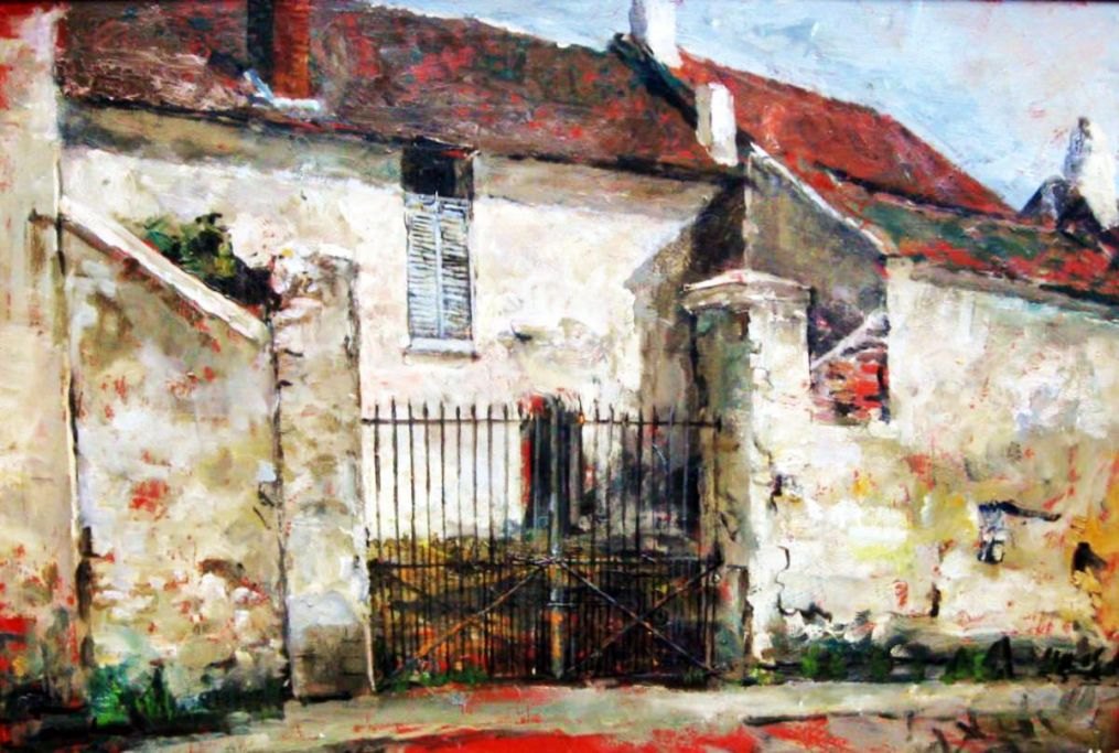 Ubekendt kunstner (20. årh.) En gård i Frankrig. Olie på masonite. Signeret.: K.J. 41 x 62 cm.