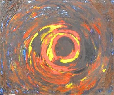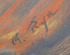 Ryo, Keiko (1932 - ) Japan: Komposition. Solopgang. Olie på lærred. Signeret: K. Ryo, og på bagsiden. 60 x 73 cm. Indrammet i sort svæveramme