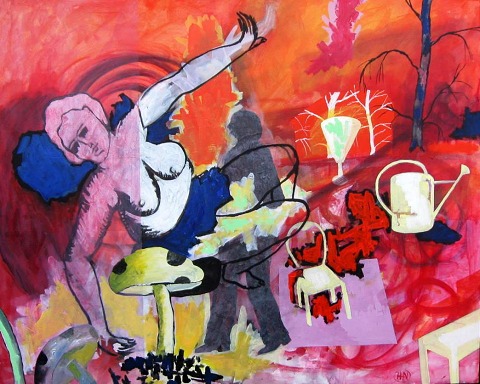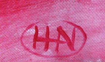 Nielsen, Hans Helge (1942- ) Danmark: Parafrase fra Max Ernst - Une semaine de Dante med fragmenter fra min have. Blandform på lærred. Signeret.: Monogram. Ligledes signeret på bagsiden. 90 x 100 cm.