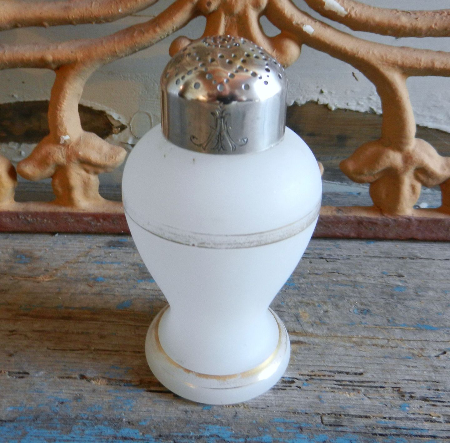 Skøn sjælden 1800tals strøer i hvid opalineglas med guld bemaling. Prop af sølv med monogram AI, utydeligt sølv stempel.