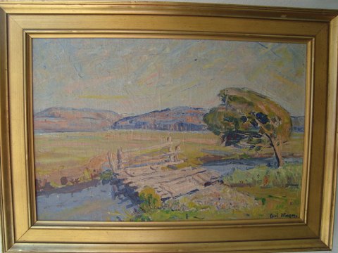 Maleri af Carl Wagn - Ålandskab med bro og vindblæst træ.