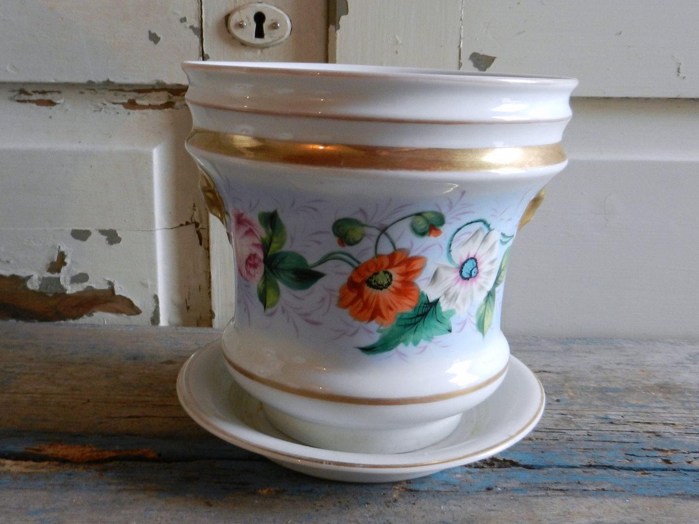 Smuk gammel urtepotteskjuler med håndmalet blomster dekoration. Fremstår med original underskål.