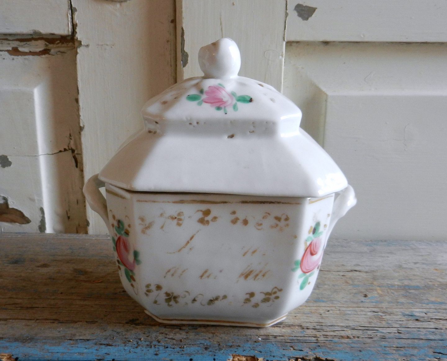 Fransk 1800tals sukker skrin, dekoreret med blomster og tekst Souvenir de la Fété, bliver også kaldt nonne porcelæn.