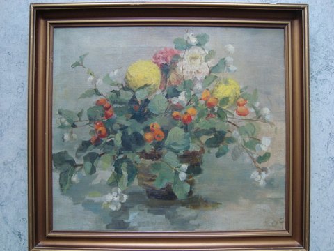 Maleri - Bærgrene og blomsterbuket i vase af Einar Olsen.