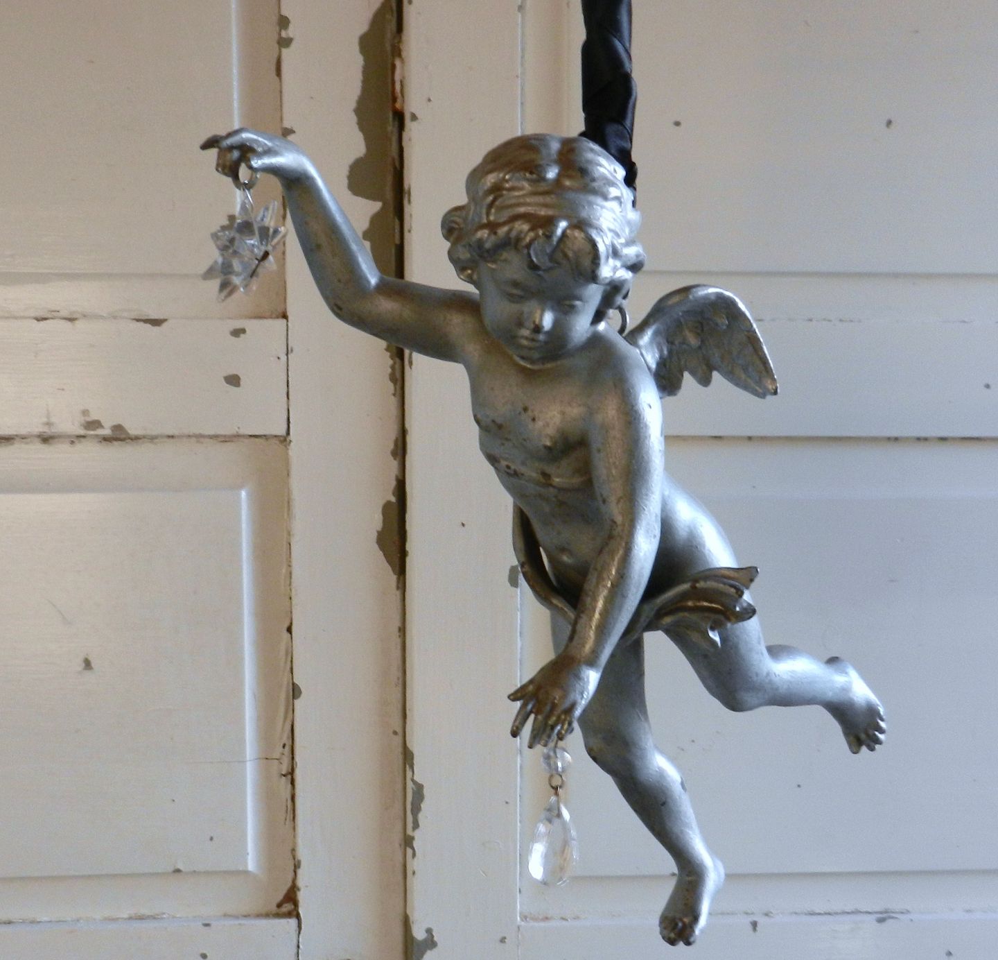 Meget smuk engel i sølv bronzeret metal. Englen holder en stjerne og en dråbeformet prisme i hænderne, den hænger i en kæde der er om viklet med sort silkebånd.