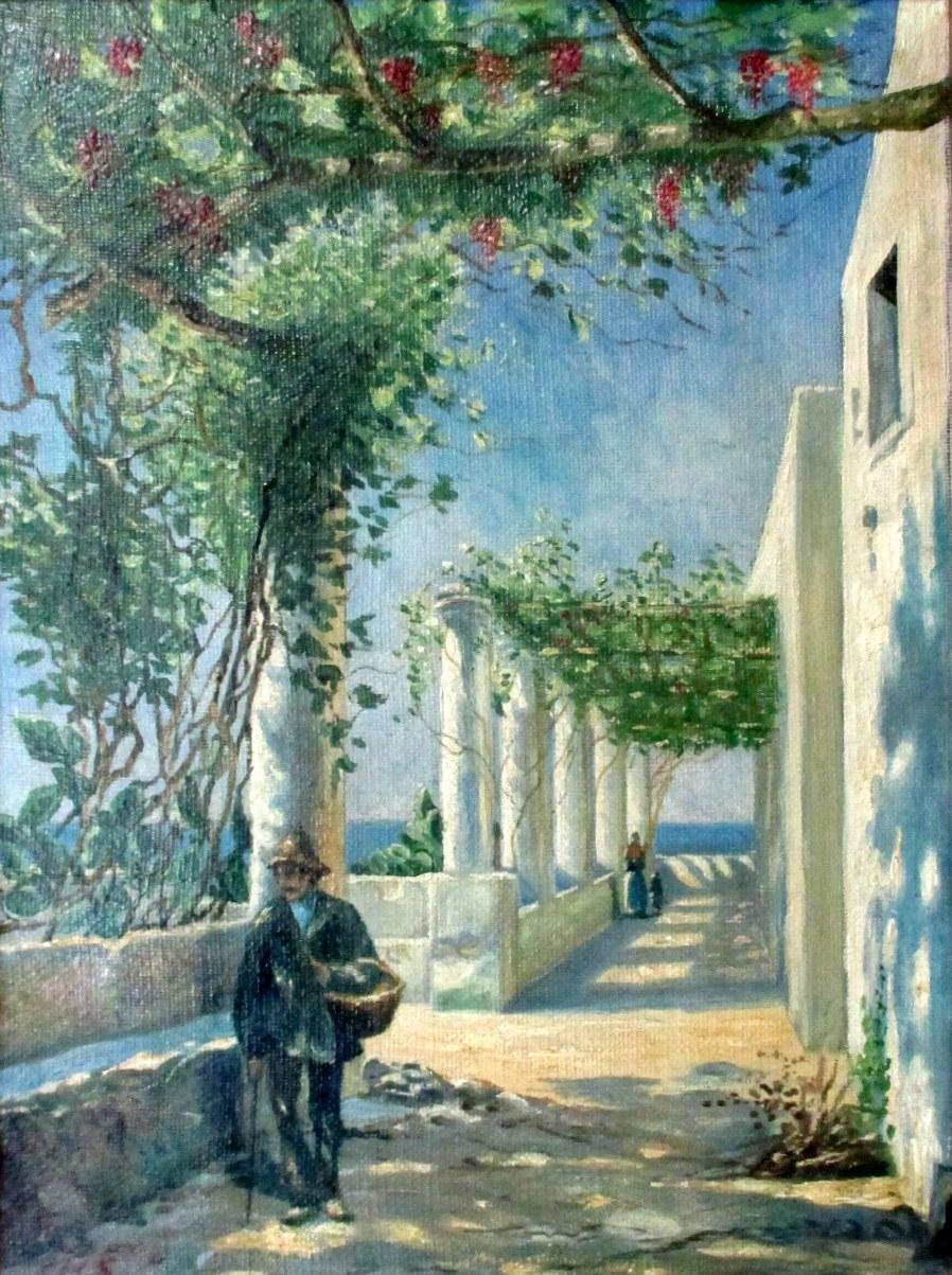 Schiøtt, H. (19./20. årh.) Danmark: En italiensk Loggia.Olie på lærred. Signeret.: monogram. 38 x 29 cm.