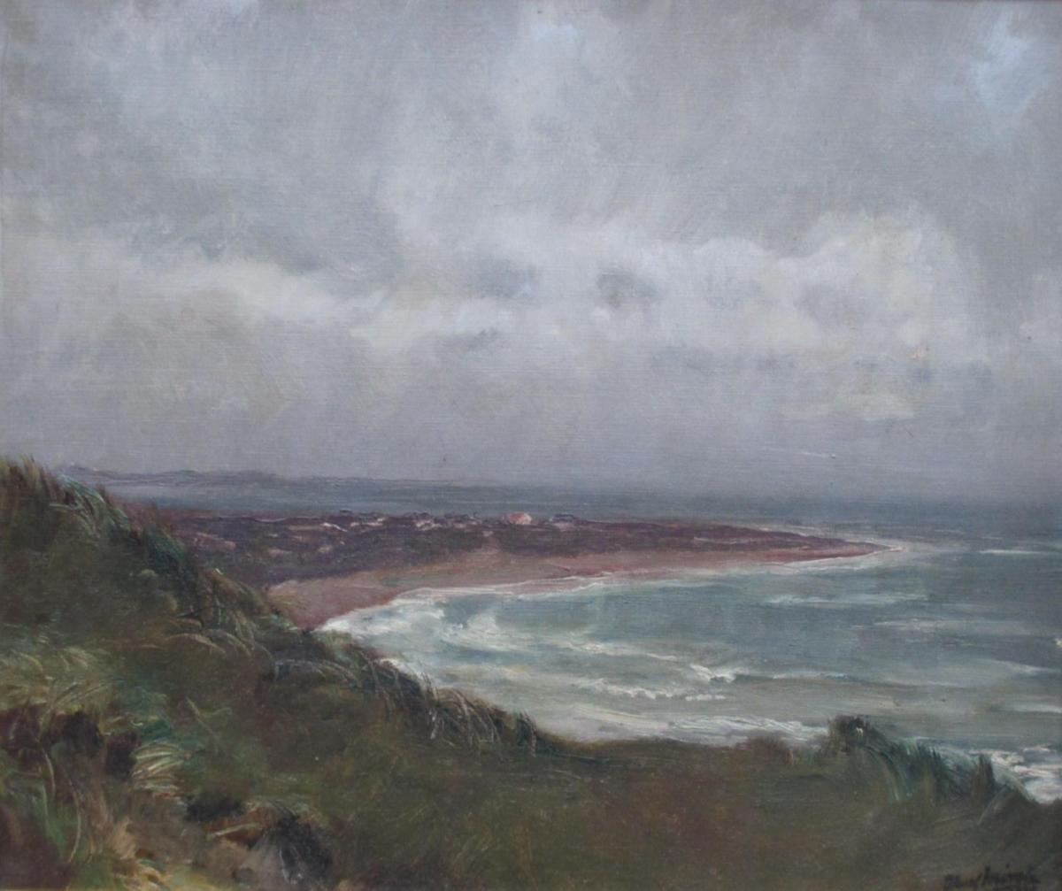 Mørch, Axel (1883 - ) Danmark: En by ved havet. Olie på lærred. Signeret: Axel Mørch 1925. 48 x 57 cm. Med samtidig ramme.