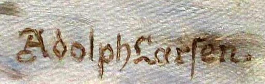 Larsen, Adolph (1856 - 1942) Danmark: Landsby motiv - vinter. OLie på lærred. Signeret.: Adolph Larsen 40 x 37 cm. Med forgyldt ramme med hjørneornamentik.