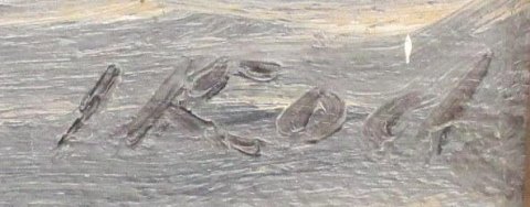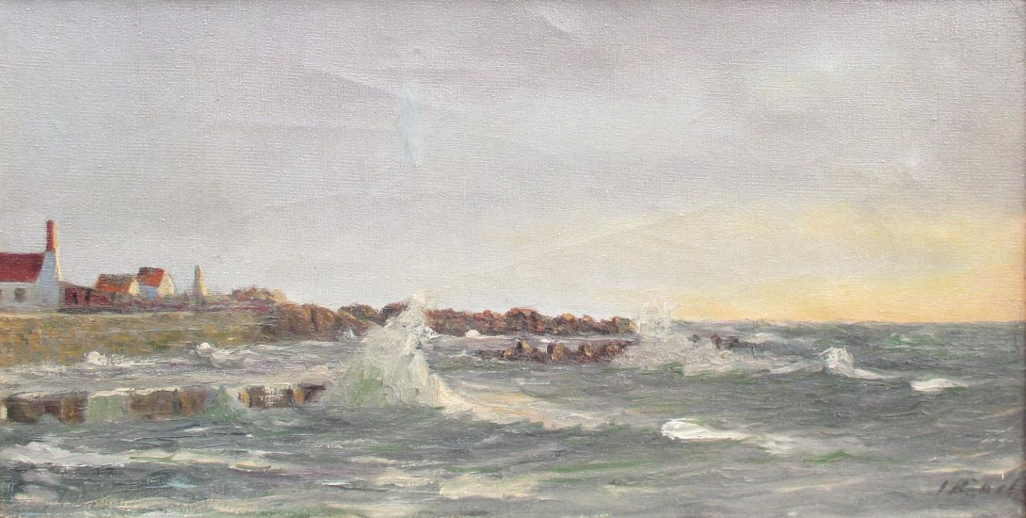 Koch, Johan (1869 - 1944) Danmark: Bølger mod kystsikringen. OLie på lærred. Signeret.: I. Koch. 26 x 51 cm.
