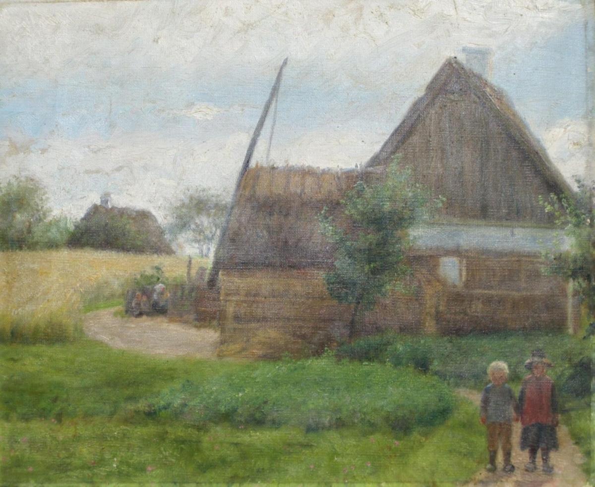 Dansk kunstner (19. årh.): Parti fra en landsby med børn på vejen. Olie på lærred. Usigneret. 29 x 35,5 cm.