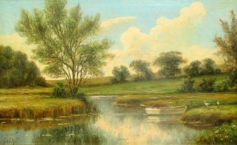 Winther, Frederik (1853 - 1916) Danmark: Augustdag ved Frederiksværk å. Olie på lærred. Signeret.: Fr. Winther. 38 x 61 cm.