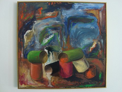 Text available in Danish: Maleri signeret "Morten" 1980 - Farve Bøtter.