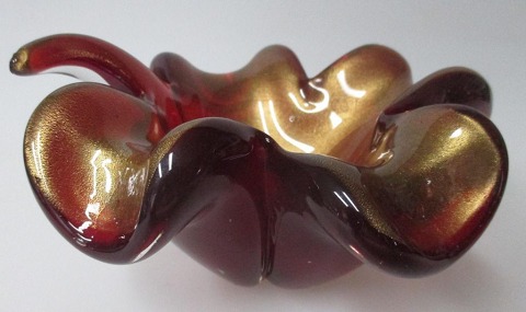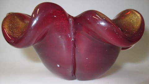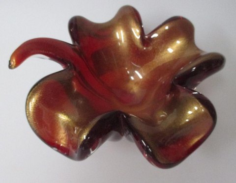 Murano skål, 20. årh. Italien. Formet som et blad. Rød glas masse med guld. H.: 8 cm. Dia.: 17 cm.
