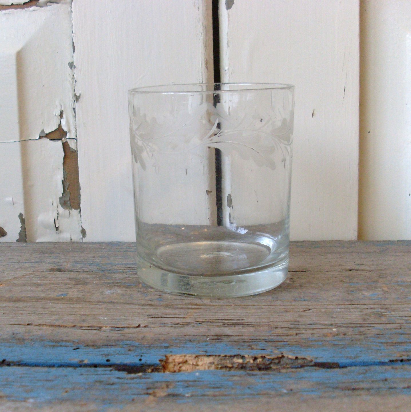 Rørformet ølglas med plan sleben bund, dekoreret med egeløv. Fra ca. 1840.