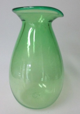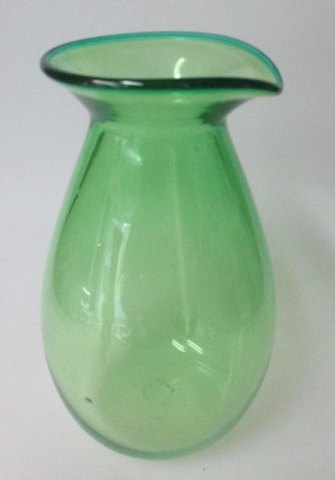 Dansk vase/ kande i grønt glas, 20. årh. Signeret , 2000. H.: 17,5 cm.