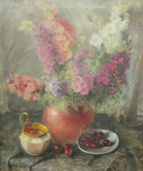 Holly, Nello (20. årh.): Blomster opstilling. Olie på lærred. Signeret: Hello Nelly. 62 x 51 cm.