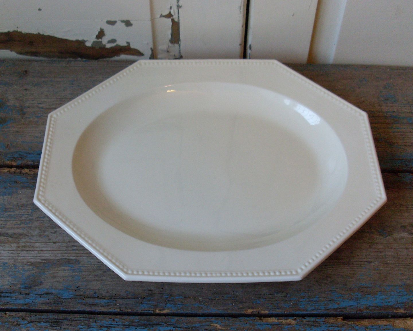 Smukt Fransk sekskantet fajance fad med perlekant.