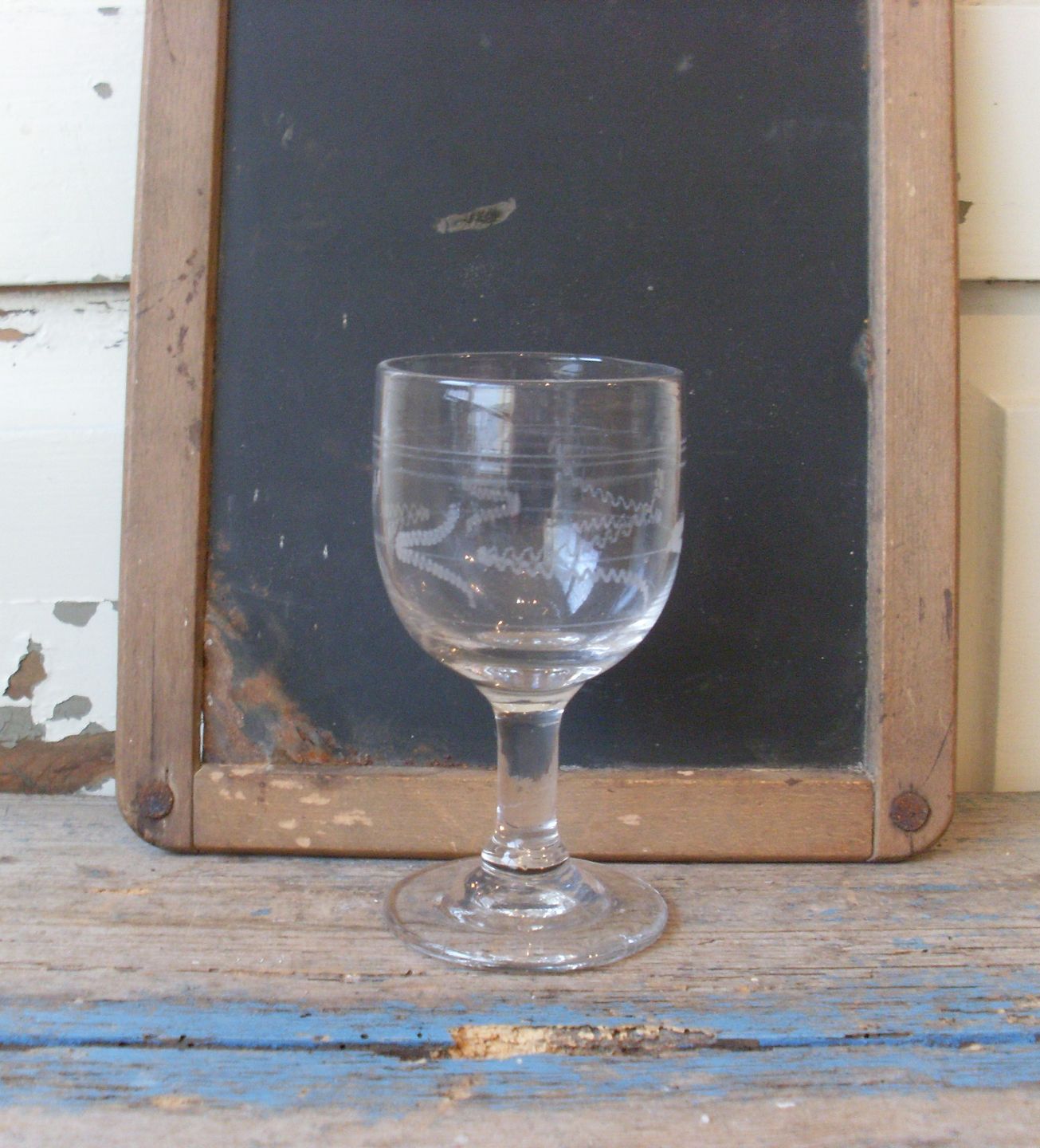 Gammelt fransk vinglas med ætset dekoration 13,5cm.