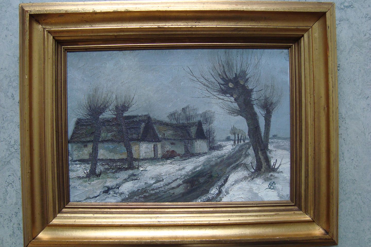 Maleri af Jens Sinding Christensen - Vinterparti med stynede popler ved vej og gårde..