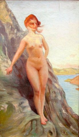 Unbekannter Künstler (19. Jh.): Eine nackte Frau auf den Felsen. Öl auf Leinwand. Signiert: Monogramm: CF. 45 x 27 cm.